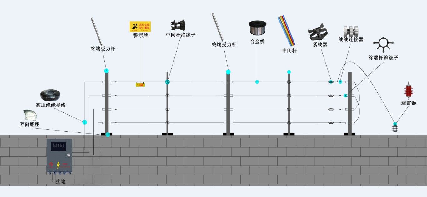 獨立式電子圍欄,直接架設(shè)在地面上。其高度約2米左右,一般安裝10-12根線纜??紤]到設(shè)備和人身安全,要求在獨立式電子圍欄的一側(cè)或兩側(cè),安裝不低于1.2m的防護墻或圍墻。其間的凈空距離應(yīng)不小于1m。使獨立式電子圍欄正常工作部位處于一個公眾通常難以接近的封閉區(qū)域內(nèi)。