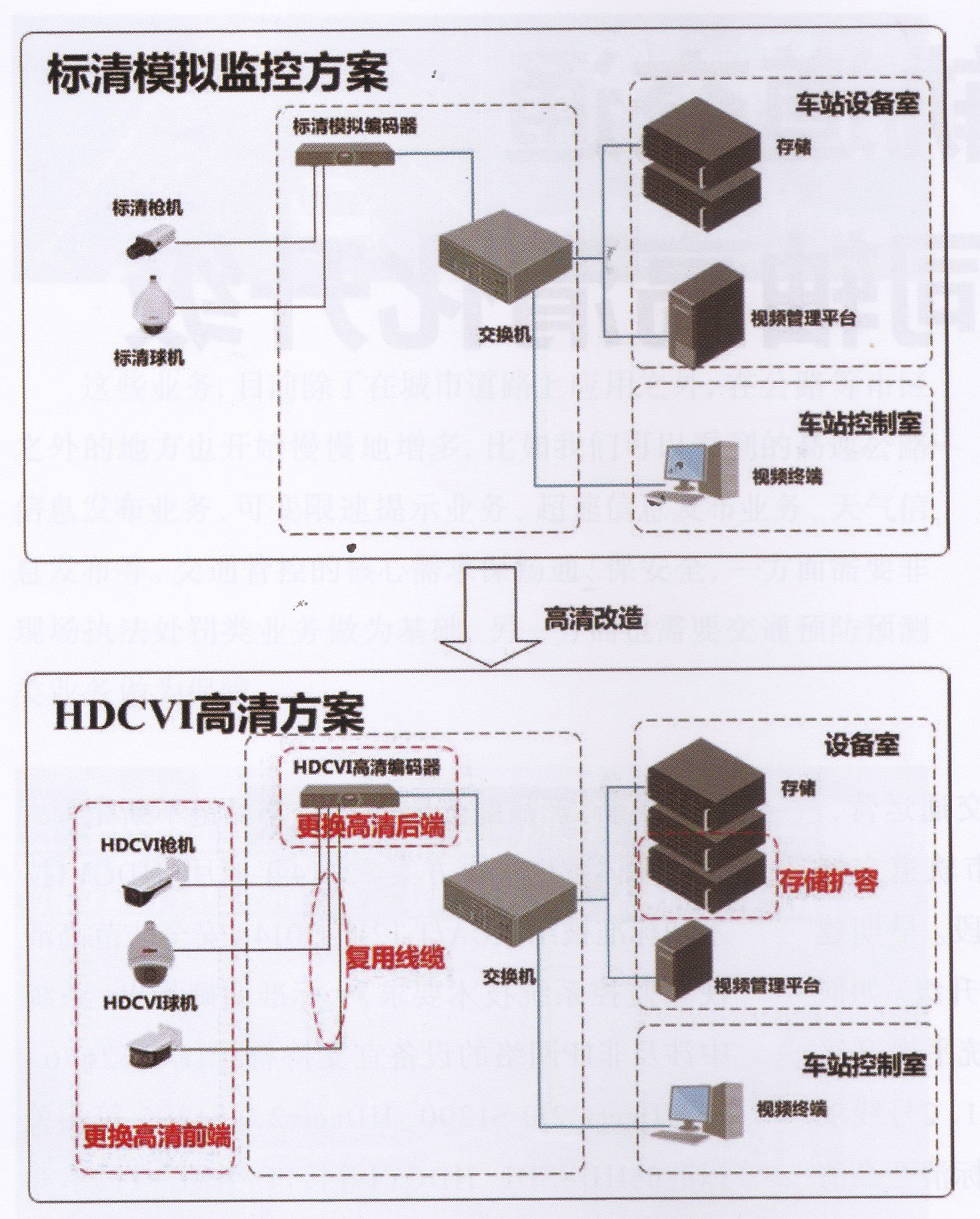 軌道交通視頻監(jiān)控系統(tǒng)是軌道交通運(yùn)營、現(xiàn)代化管理的配套設(shè)備,是維護(hù)城市軌道交通 運(yùn)行和保證公共安全的重要輔助手段。早期建設(shè)項(xiàng)目仍以模擬監(jiān)控為主,急需高清升級(jí)。如何以最小的代價(jià)實(shí)現(xiàn)標(biāo)清視頻監(jiān)控系統(tǒng)平滑升級(jí)高清視頻監(jiān)控系統(tǒng),本文以寧波地鐵1、2號(hào)線項(xiàng)目為例,就如何實(shí)現(xiàn)視頻監(jiān)控由模擬標(biāo)清至高清的升級(jí)探索,提出了HDCVI同軸高清升級(jí)方案進(jìn)行探討。 HDCVI同軸高清技術(shù)發(fā)展 HDCVI同軸高清技術(shù)是一種基于已有同軸電纜(SYV75-3或SYV75-5)的高清視頻傳輸技術(shù)。HDCVI技術(shù)能夠在同軸電纜上實(shí)現(xiàn)超長距離的高清視頻信號(hào)傳輸,同時(shí)支持音頻與雙向數(shù)據(jù)通信信號(hào)。相比HD-SDI同軸高清技術(shù)在實(shí)際應(yīng)用中對(duì)傳輸介質(zhì)的高要求,HDCVI技術(shù)可以適應(yīng)長距離、低成本的傳輸介質(zhì)以及復(fù)雜的部署場合。 HDCVI同軸高清技術(shù)于2002年正式發(fā)布,迅速在全球范圍內(nèi)進(jìn)行卓有成效的技術(shù)推廣,并率先進(jìn)行產(chǎn)品化和系統(tǒng)化。時(shí)至今日,技術(shù)不斷發(fā)展更新,產(chǎn)品配套日漸豐富,產(chǎn)品鏈不斷完善,已構(gòu)建體系化解決方案。 2015年發(fā)布的HDCVI 3.0技術(shù),對(duì)多方面進(jìn)行了改進(jìn),提升了原有1080P和720P的視頻傳輸距離、支持1440P(2K)和2160P(4K)的高清視頻傳輸、增加了同軸供電技術(shù)(POC)。HDCVI技術(shù)的不斷發(fā)展,已形成了成熟的市場和方案。 H DCVI同軸高清技術(shù)在交通改造中的應(yīng)用 寧波軌道交通1、2號(hào)線原有的標(biāo)清同軸視頻監(jiān)控可通過將攝像機(jī)及編碼器更換為支持HDCVI技術(shù)的高清編解碼設(shè)備來進(jìn)行高清化升級(jí)。 東莞監(jiān)控工程公司表示 在標(biāo)清視頻監(jiān)控升級(jí)為高清方案中,原前端攝像機(jī)更換為HDCVI攝像機(jī),通過同軸電纜將視音頻、控制信號(hào)傳輸?shù)胶蠖说?/span>HDCVI高清編碼設(shè)備,舊的編碼存儲(chǔ)設(shè)備需要替換為 HDCVI編碼器,而后端存儲(chǔ)可以繼續(xù)使用或者簡單的擴(kuò)容即可滿足要求。