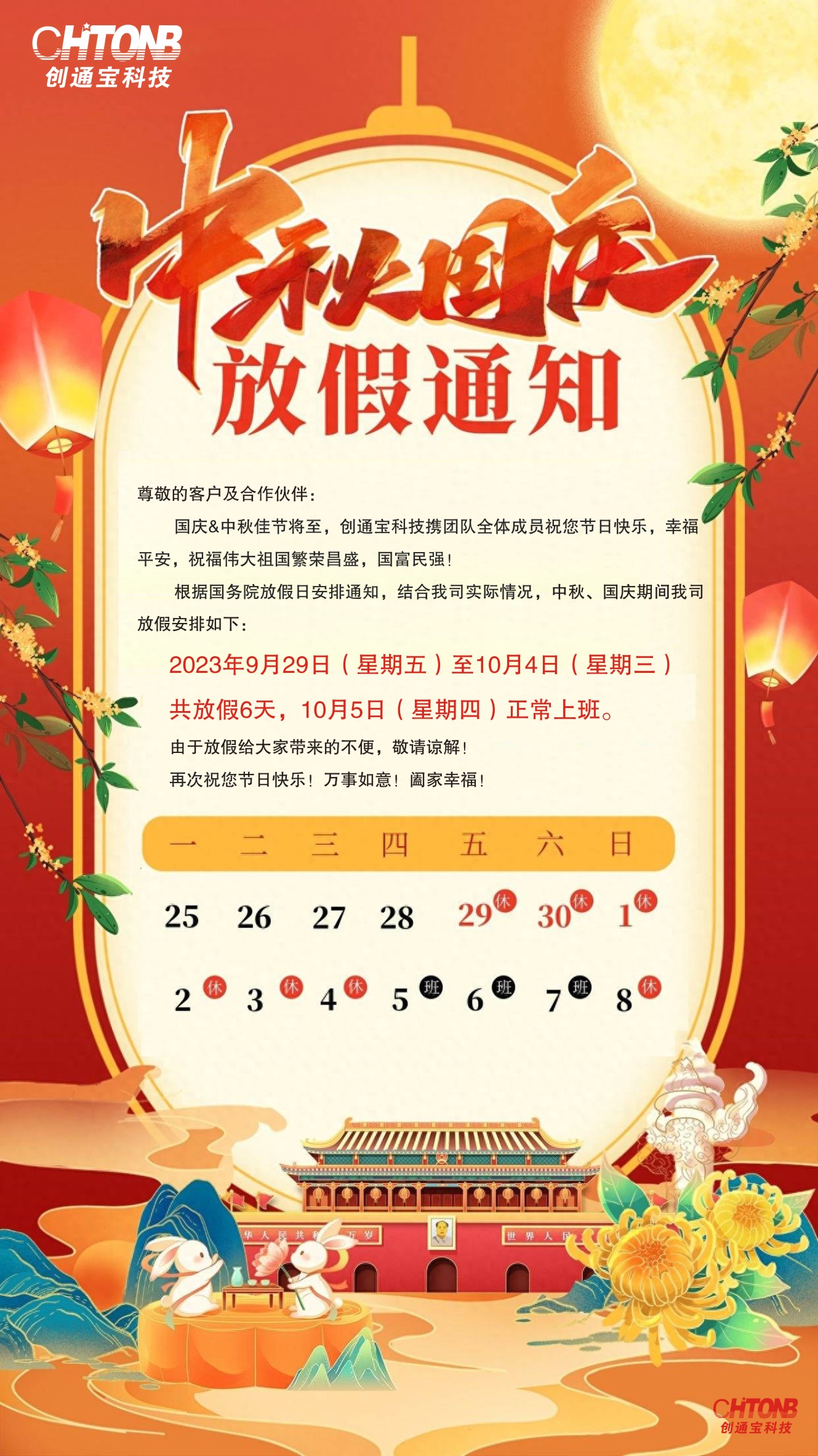 尊敬的客戶及合作伙伴: 國慶&中秋佳節(jié)將至,創(chuàng)通寶科技攜團(tuán)隊全體成員祝您節(jié)日快樂,幸福平安,祝福偉大祖國繁榮昌盛,國富民強(qiáng)! 根據(jù)據(jù)國務(wù)院放假日安排通知,結(jié)合我司實際情況,中秋、國慶期間我司放假安排如下: 2023年9月29日(星期五)至10月4日(星期三)共放假6天,10月5日(星期四)正常上班。 由于放假給大家?guī)淼牟槐悖凑堈徑猓?/font> 再次祝您節(jié)日快樂!萬事如意!闔家幸福!